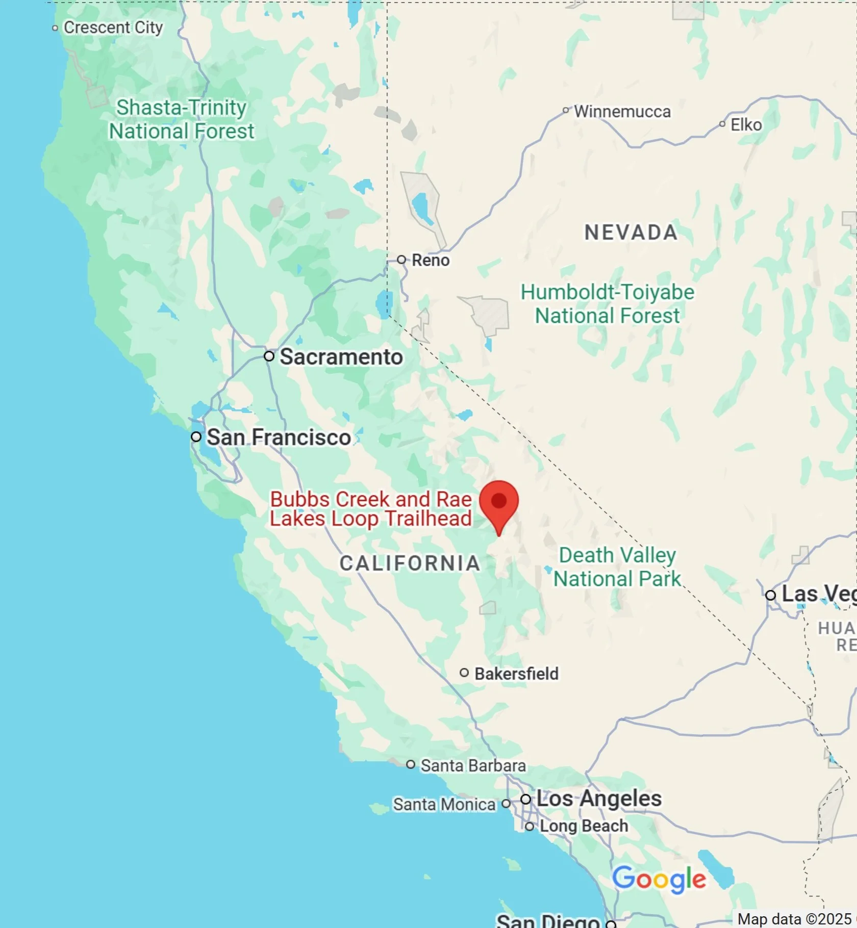Location (Red icon) of the Rae Lakes Trailhead in Kings Canyon National Park, California