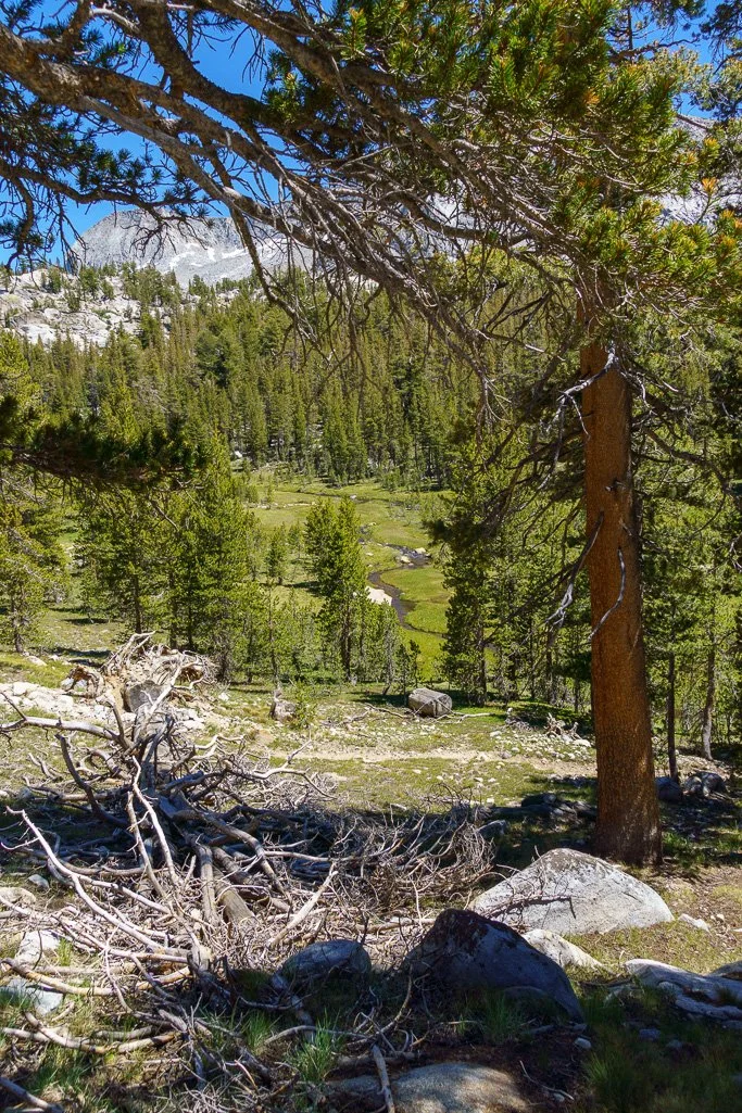 Near the outlet of Florence Lake was a small campsite reported in a guidebook, where I planned to spend the night. The outlet flowed down granite walls just to the east of the creek, and the creek crossing was sketchy enough to make me pack up my camera in a waterproof bag. I decided to cross the creek in the morning and look for the campsite. I found two in the woods; one was on a high cliff that got more sun, and the second deeper in the woods in a tree-filled meadow. I set up my tent on the cliff and ate in the meadow site, enjoying the solitude. I hadn't seen another soul all day since I left Vogelsang Backpacker's Camp!